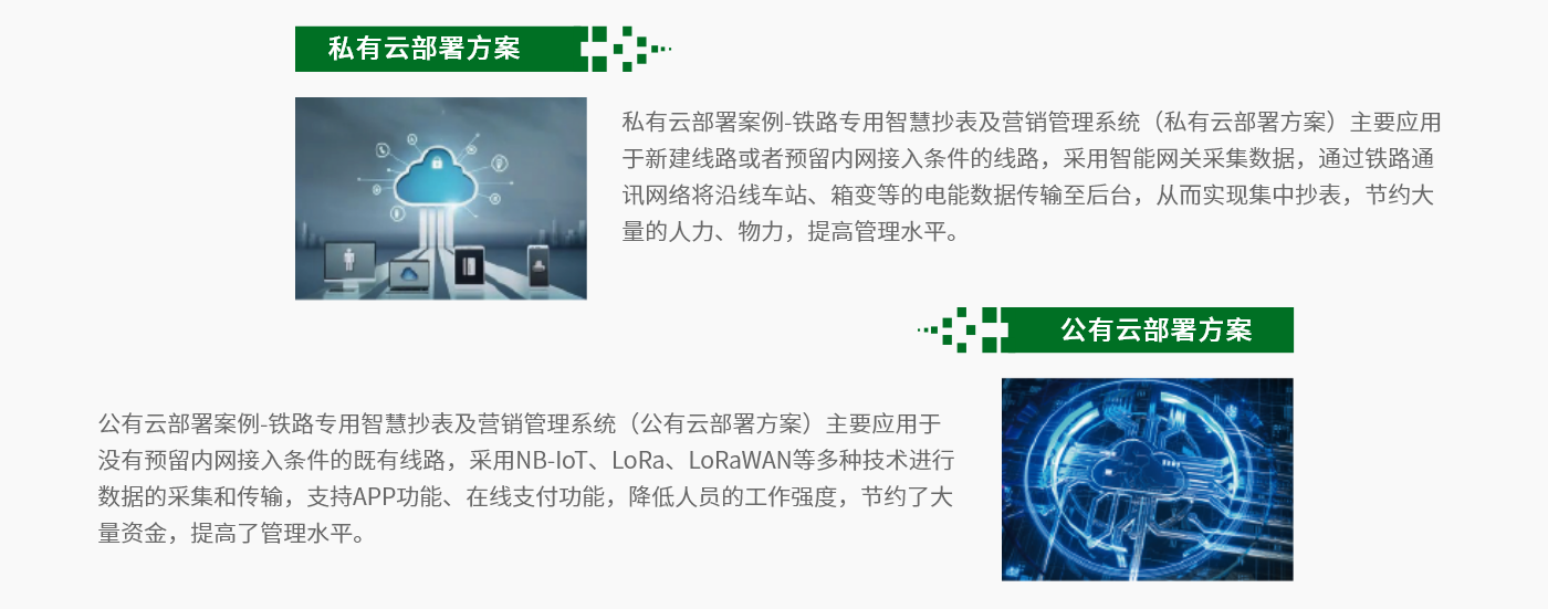 鐵路專用智慧抄表及營銷管理系統可部署在公有云服務器(阿里云、華為云等)或私有云服務器(供電段、供電車間的數據中心或機房),對管轄范圍內的電表、水表等進行遠程采集,集中管理,綜合分析。采用有線、無線、公網、內網、工業總線等多種通訊技術相結合的方式,可應用于新建、改造項目。