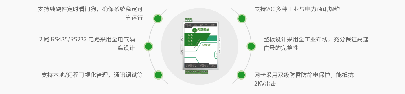 ASDU-LE通訊管理機,CPU 采用成熟的高性能工業處理器,內核為ARM926EJ 核。支持超寬壓交直流供電輸入,多重電源保護,抗靜電、過 流、防反接等保護能有效保證野外等惡劣環境下的可靠運行。2 路 RS485/RS232 電路采用全電氣隔離設計,RS485 電路采用三級防雷防靜電保護,支持 GB/T 17626.5-2008 標準中 10/700uS 測試的最高等級 4KV 防護。